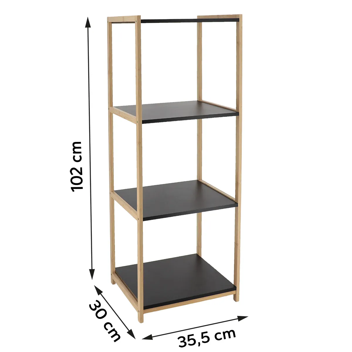 Corp mobilier 4 rafturi MDF 102x30x35,5 cm – Bamboo / Negru | Mobilier depozitare baie. Corpul de mobilier pentru baie cu 4 rafturi, realizat din MDF este soluția ideală pentru organizarea practică și elegantă a spațiului. Designul modern, cu rafturi negre și structură din bambus natural, creează un contrast rafinat, potrivit pentru băi contemporane, minimaliste sau industriale. Cele 4 rafturi deschise oferă spațiu generos pentru depozitarea produselor de igienă, cosmeticelor, prosoapelor sau accesoriilor de baie. Structura verticală ajută la economisirea spațiului, fiind ideală pentru băi mici sau medii, dar și pentru bucătărie, hol sau dressing. Țara de origine: CN.