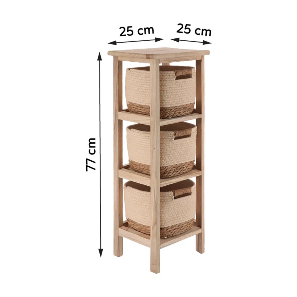 Corp mobilier lemn 3 cosuri Bumbac/Iarba de mare 77x25x25 cm – Natural/ Bej | Mobilier depozitare baie. Corpul de mobilier pentru baie din lemn natural, prevăzut cu 3 coșuri din bumbac și iarbă de mare, este soluția ideală pentru organizarea practică și estetică a spațiului sanitar. Designul său natural, în nuanțe bej, aduce un plus de căldură și armonie în orice baie, fiind potrivit atât pentru stiluri moderne, cât și rustice. Structura verticală din lemn este rezistentă și stabilă, iar cele 3 coșuri detașabile oferă spațiu generos pentru depozitarea produselor de igienă, prosoapelor sau accesoriilor de baie. Materialele naturale asigură un aspect elegant și o bună ventilare a conținutului. Țara de origine : CN.