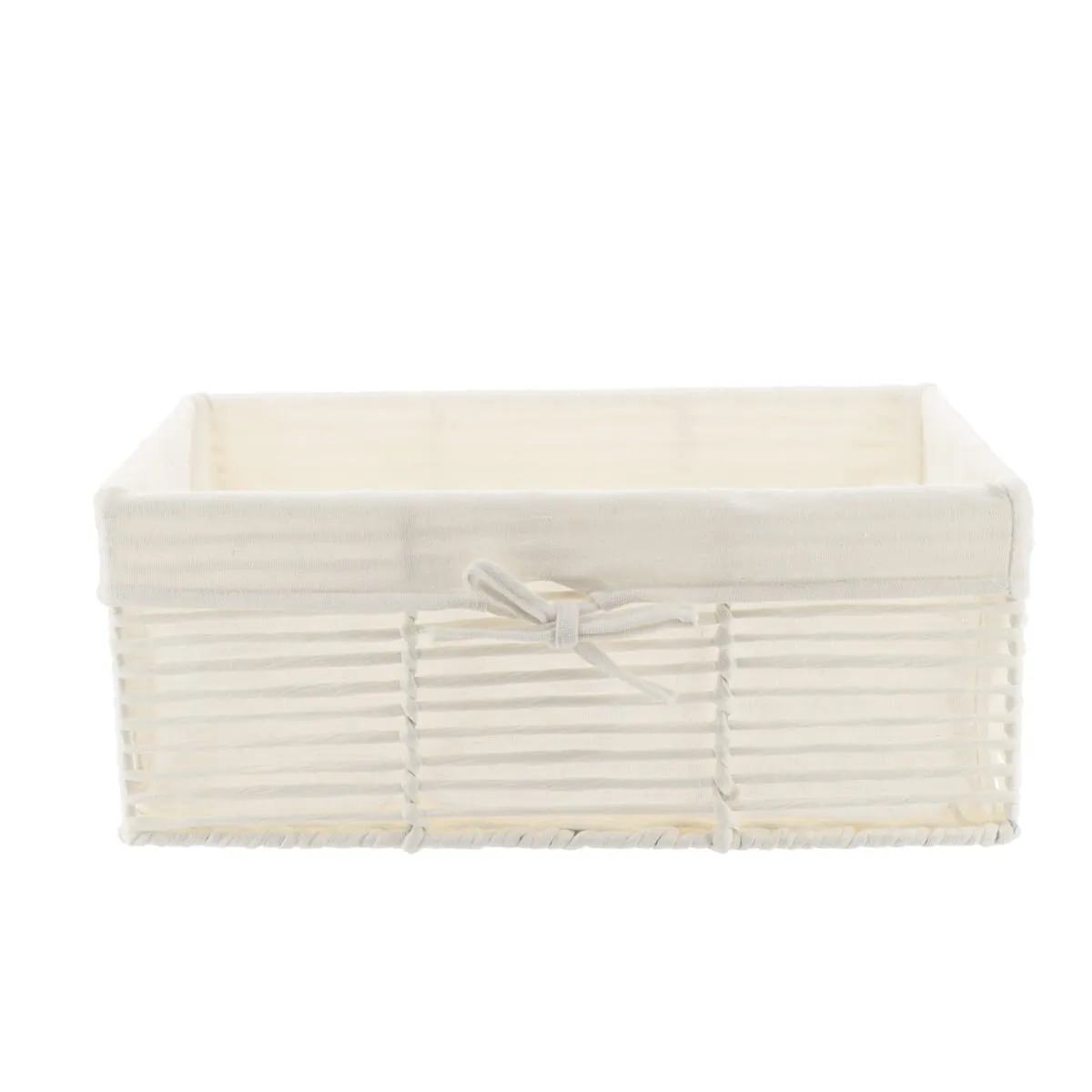 Coș depozitare HÂRTIE / METAL / IN 39X26X15,5 cm – Alb | Organizatoare baie. Organizează eficient spațiul cu coșul de depozitare realizat din hârtie împletită și metal, prevăzut cu husă interioară din in, o soluție practică și estetică pentru baie sau alte zone ale locuinței. Coșul este construit pe o structură rezistentă din metal, care oferă stabilitate și durabilitate, iar exteriorul este finisat cu hârtie împletită în nuanță alb, pentru un aspect elegant și modern. Interiorul este căptușit cu o husă din in, detașabilă, ce protejează conținutul și adaugă un plus de rafinament și funcționalitate. Forma rectangulară permite depozitarea organizată a cosmeticelor, produselor de îngrijire, accesoriilor sau a altor obiecte de uz zilnic. Culoarea albă îl face ușor de integrat în diverse stiluri de amenajare, de la modern la clasic. Țara de origine: CN.