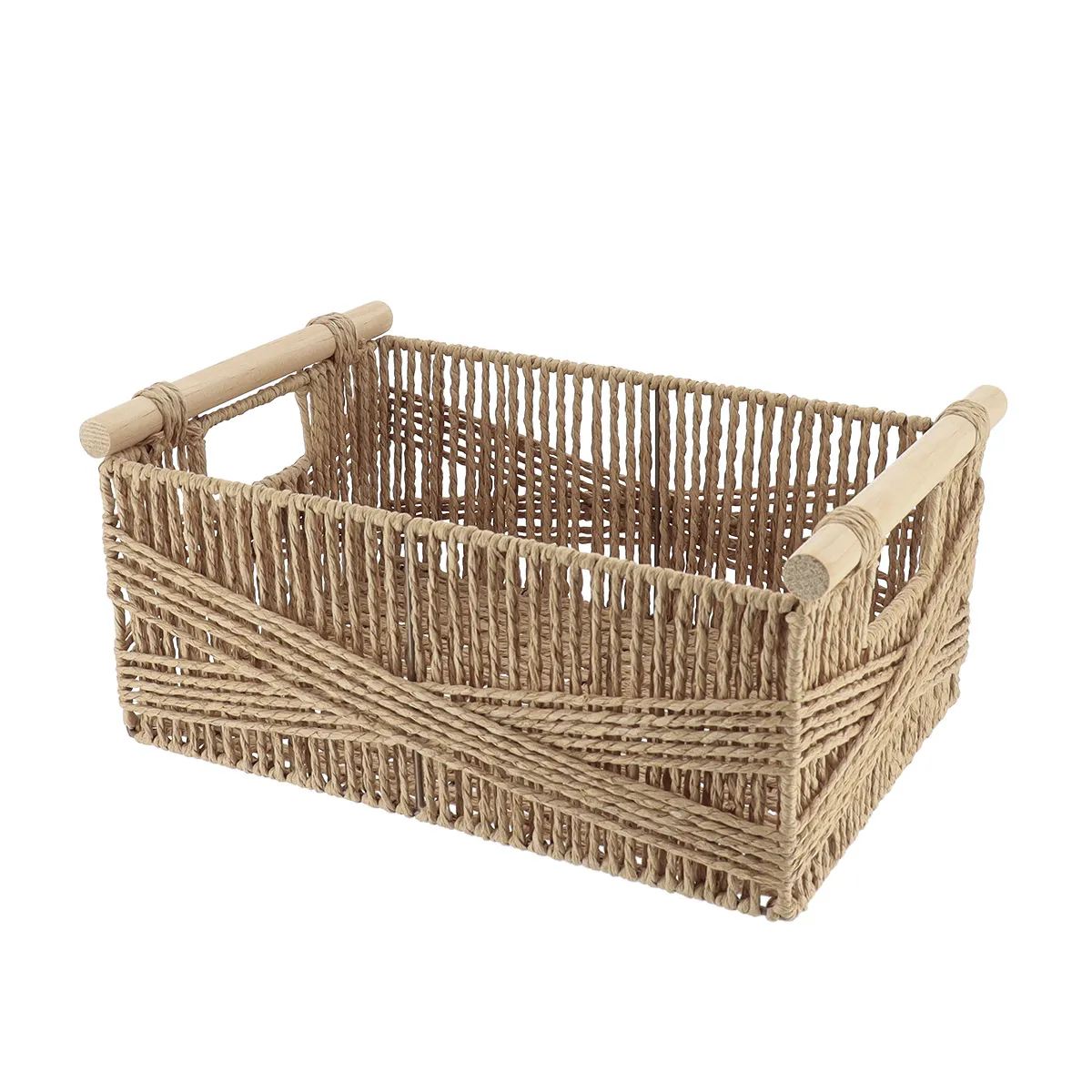 Coșul este prevăzut cu o structură rezistentă din metal, care oferă stabilitate și durabilitate, iar exteriorul este îmbrăcat în hârtie împletită în nuanță naturală, pentru un aspect cald și aerisit, mânerele laterale din lemn facilitând transportul. Forma rectangulară, 34X23,5X14 cm , permite depozitarea organizată a produselor de baie, cosmeticelor, prosoapelor mici sau accesoriilor de uz zilnic. Designul natural se integrează ușor în amenajări moderne, rustice sau cu influențe naturale, adăugând un plus de ordine și funcționalitate. Țara de origine: CN.