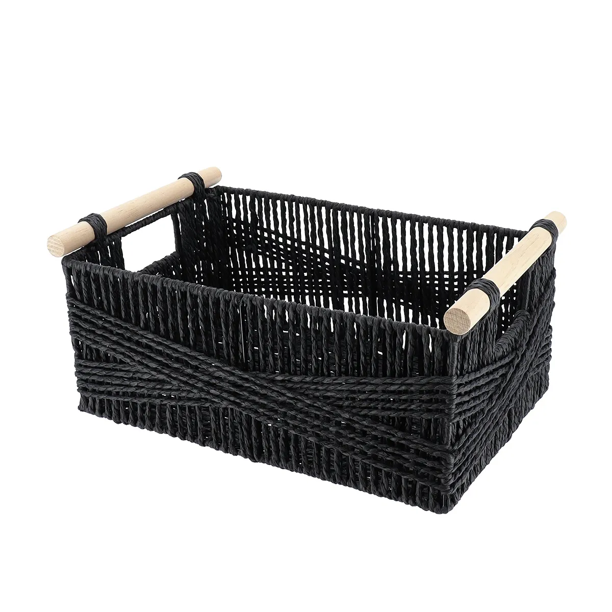 Coș depozitare HÂRTIE / METAL / LEMN 34X23,5X14 cm – Negru | Organizatoare baie. Adaugă un plus de ordine și stil cu coșul de depozitare realizat din hârtie împletită, cu structură metalica și mânere din lemn, o soluție practică și decorativă pentru organizarea spațiului din baie sau din alte încăperi ale locuinței. Coșul dispune de o structură solidă din metal, care asigură stabilitate și rezistență în utilizare, iar exteriorul este realizat din hârtie împletită în nuanță neagră, oferind un aspect elegant și modern. Mânerele din lemn facilitează transportul și adaugă un contrast natural plăcut, accentuând designul rafinat al produsului. Forma rectangulară și dimensiunile generoase permit depozitarea organizată a prosoapelor, cosmeticelor, produselor de baie sau a altor accesorii de uz zilnic.