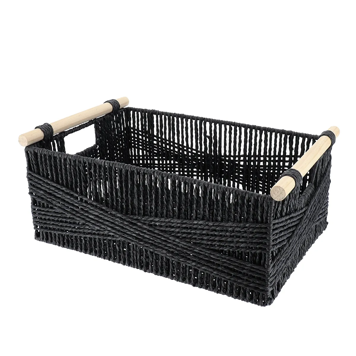 Coș depozitare HÂRTIE / METAL / LEMN 39X27X15,5 cm Negru | Organizatoare baie. Adaugă un plus de ordine și stil cu coșul de depozitare realizat din hârtie împletită, cu structură metalica și mânere din lemn, o soluție practică și decorativă pentru organizarea spațiului din baie sau din alte încăperi ale locuinței. Coșul dispune de o structură solidă din metal, care asigură stabilitate și rezistență în utilizare, iar exteriorul este realizat din hârtie împletită în nuanță neagră, oferind un aspect elegant și modern. Mânerele din lemn facilitează transportul și adaugă un contrast natural plăcut, accentuând designul rafinat al produsului. Forma rectangulară și dimensiunile generoase permit depozitarea organizată a prosoapelor, cosmeticelor, produselor de baie sau a altor accesorii de uz zilnic.