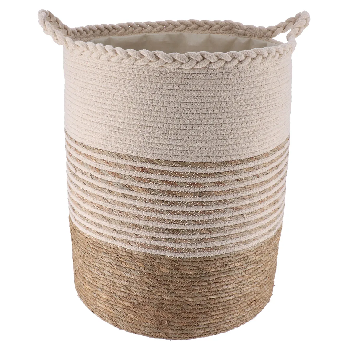 Coș rufe IUTA/BUMBAC/POLIESTER mare 40X50 cm – Natural/Bej | Organizatoare baie. Coșul de rufe mare, realizat din iută, bumbac și poliester, este ideal pentru organizarea eficientă a băii, dormitorului sau dressingului. Designul său decorativ, în nuanțe natural/bej, oferă un aspect cald și elegant, ușor de integrat în interioare moderne sau scandinave. Acest coș face parte dintr-un set de 5 coșuri cu dimensiuni și forme diferite (rotunde și ovale), conceput pentru a oferi soluții versatile de depozitare. Poate fi utilizat atât individual, cât și împreună cu celelalte coșuri din set, pentru un aspect unitar. Este potrivit pentru rufe, prosoape, textile sau accesorii, fiind prevăzut cu mânere integrate pentru transport ușor si husă interioară textilă cu șnur de strângere, care permite închiderea rufelor în interior, menținând un aspect ordonat și curat.